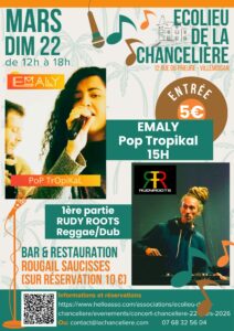 - Concert d’Emaly, le dimanche 22 mars 2026Ecolieu de la Chancelière 12 rue du prieuré 49370 Villemoisan Dimanche 22 Mars – 12H à 18H Entrée : 5€ Rougail Saucisses (recette de Céline)… Lire la suite : Concert d’Emaly, le dimanche 22 mars 2026